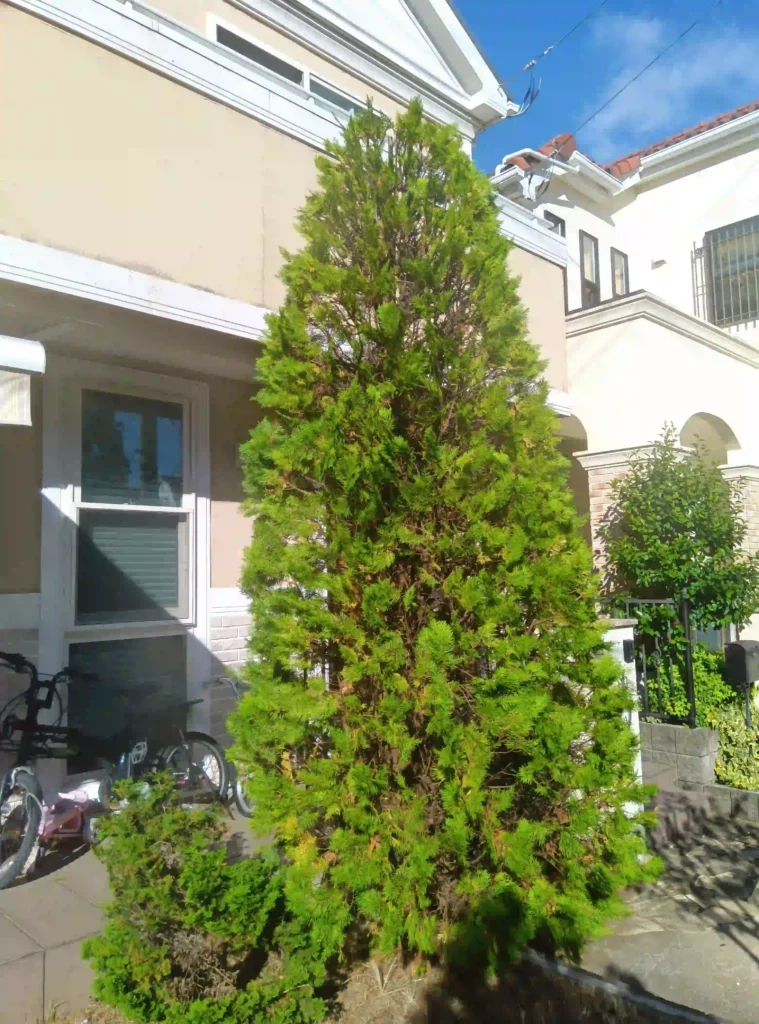 お客様の「圧迫感を解消し、木を小さくしたい」というご要望に対し、植木屋涼風はまず、コニファーの特性と剪定の鉄則について丁寧にヒアリングとご説明を行いました。