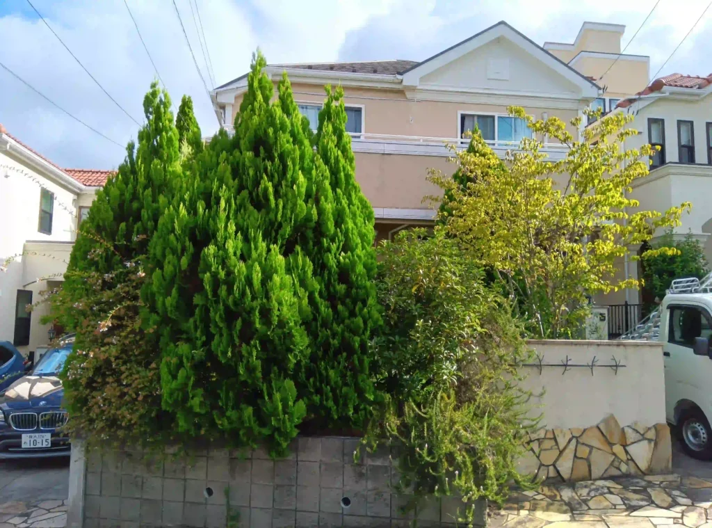 横浜市青葉区にお住まいのお客様より、庭木、特にコニファーの剪定をご依頼いただきました。